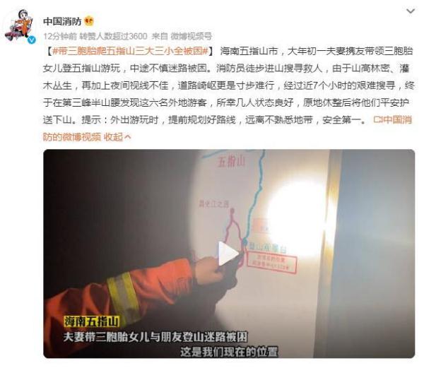 海南五指山市,大年初一夫妻携友带领三胞胎女儿登五指山游玩,中途不慎迷路被困。消防员徒步进山搜寻救人,由于山高林密、灌木丛生,再加上夜间视线不佳,道路崎岖更是寸步难行,经过近7个小时的艰难搜寻,终于在第三峰半山腰发现这六名外地游客,所幸几人状态良好,原地休整后将他们平安护送下山。提示:外出游玩时,提前规划好路线,远离不熟悉地带,安全第一。