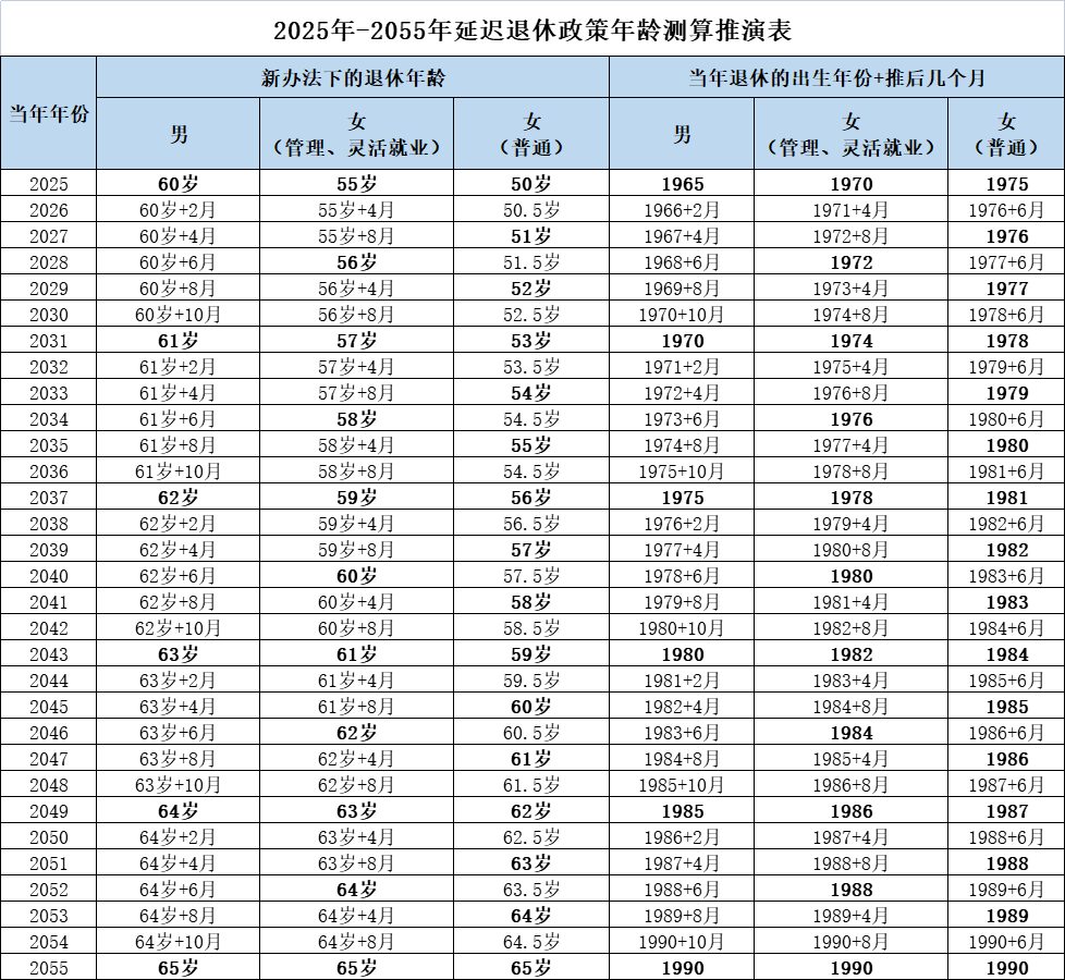 2025延迟退休政策年龄测算推演表 延迟退休方案2025年正