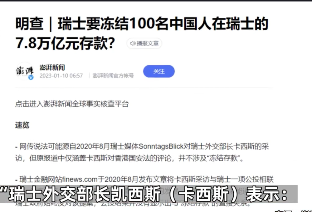 近日,又有网传称,瑞士外交部长对外宣布:“若中方坚持香港国安法,将冻结100名中国人在瑞士的7.8万亿元存款”!