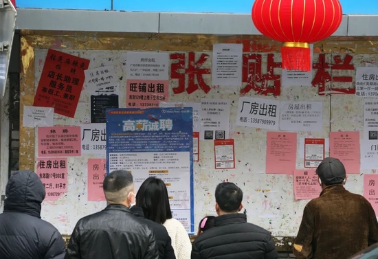 浙江省湖州市德清县乾元镇镇县桥头、农贸市场等几处张贴栏的招聘信息吸引不少人观看。中新社发 小绍兴 摄