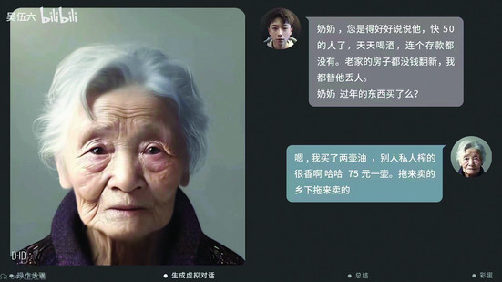 小亮的视频中,AI“奶奶”可以和他进行简略的对话,例如小亮问,“奶奶,春节的东西买了吗?”AI“奶奶”答复,“我买了两壶油,他人榨的很香,75元一壶。”视频的后半段是小亮的“喃喃自语”,他告知“奶奶”,自己最近升职加薪了,又买了许多件衣服,不必忧虑自己,还提示“奶奶”不要总是穿打补丁的衣服,不要着凉。最终,小亮告知“奶奶”,晚上不回来吃饭了,让“奶奶”不必等自己。