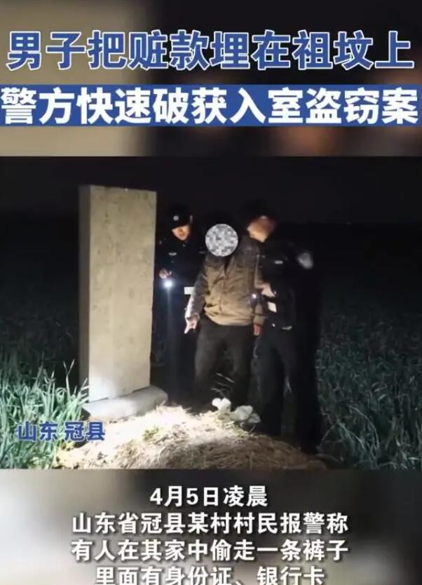 4月5日,山东聊城。派出所接到某村居民报警,称有人在其家中偷走一条裤子,里面有身份证、银行卡和现金等物品。民警迅速出警对现场进行勘验,并抓获嫌疑人。经审讯,嫌疑人交代其将盗窃来的8000元现金放在了易拉罐里,担心别人发现,又将易拉罐埋到自家祖坟上。目前,嫌疑人已被刑拘。
