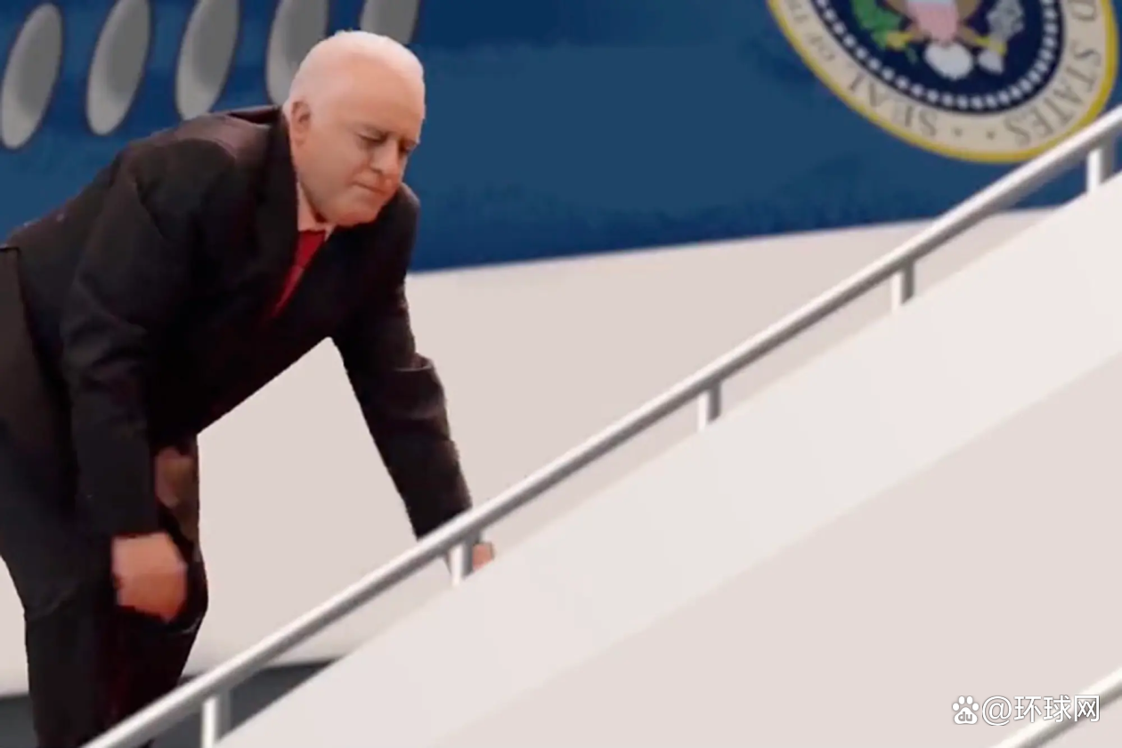 (扮演拜登的演员面向美国国旗挥手致意的画面,图源:《纽约邮报》 《纽约邮报》还描述了该短片中的另外一个场景:上述扮演拜登的演员在登上类似美国总统专机“空军一号”舷梯的过程中踉跄跌倒,而扮演哈里斯的演员“惊恐”地看着他。《纽约邮报》称,该短片是在取笑拜登常有失去平衡的失态行为。