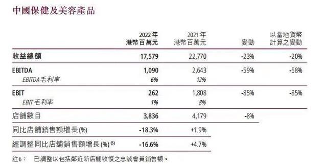 一个月前(3月16日),屈臣氏母公司发布2022年财报。财报显现,屈臣氏2022年全球总营收同比下滑2%至1696.45亿港元,EBITDA(税息折旧及摊销前赢利)为143.09亿港元,同比下滑11%,跌至2020年的水平。其间,屈臣氏在中国市场的营收同比下滑23%至175.79亿港元,EBITDA为10.9亿港元,下滑59%。