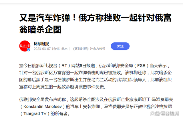 而就在最近,3月7日,俄罗斯联邦安全局挫败了一起汽车爆炸案,从俄罗斯企业家康斯坦丁·马洛费耶夫的座驾上拆除一枚炸弹,避免了他重蹈杜金娜的悲剧。