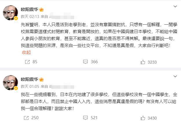 知名港星欧阳震华,年龄已到 61 岁,十分关心国家大事,3 月 28 日凌晨,他疑惑地连发两文,质疑开在内地的日本人学校之事。