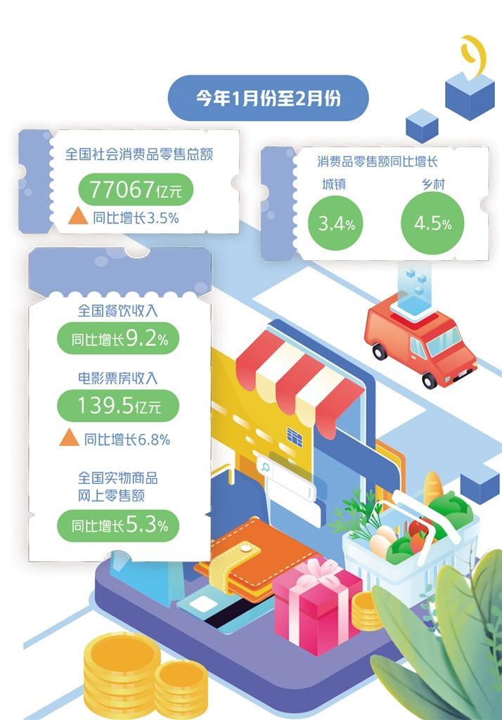 本年以来,各地量体裁衣展开了五光十色的促消费活动,步行街、商圈客流量明显添加,消费需求会集开释。据商务部监测,新年期间全国要点零售和餐饮企业销售额与上一年同期相比添加6.8%。1月至2月,全国社会消费品零售总额7.7万亿元,同比添加3.5%,除轿车以外的消费品零售额添加5%。