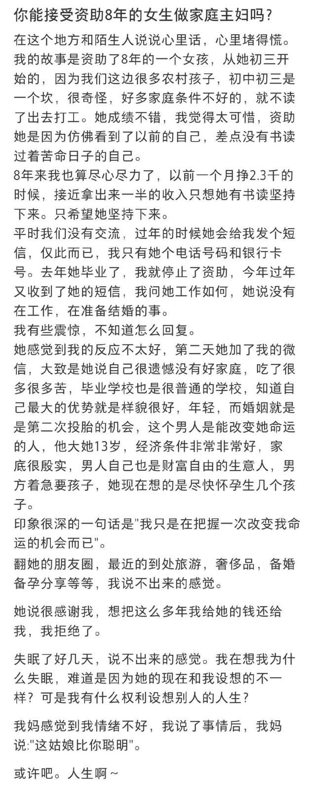 从资助的角度看,博主的资助确实也帮了女孩。就像她自己写的,她也没有权利设想别人的人生。