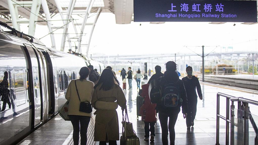 2023年3月17日,旅客在上海虹桥站站台上车。视觉中国图