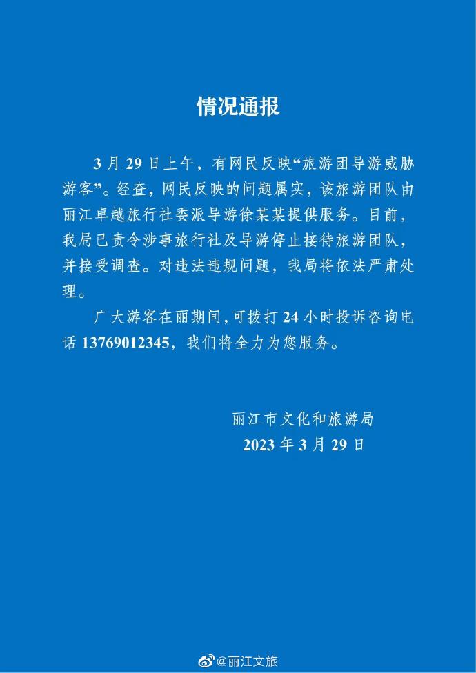 据云南丽江市文化和旅游局官方微博消息,丽江市文化和旅游局29日发布通报,3月29日上午,有网民反映 旅游团导游威胁游客 。经查,网民反映的问题属实,该旅游团队由丽江卓越旅行社委派导游徐某某提供服务。