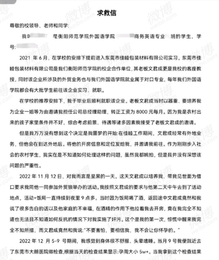 近日,湖南衡阳。网传衡阳师范学院一女生发布了一封求救信,信中称参加校企合作实习,被领导性侵并怀孕。