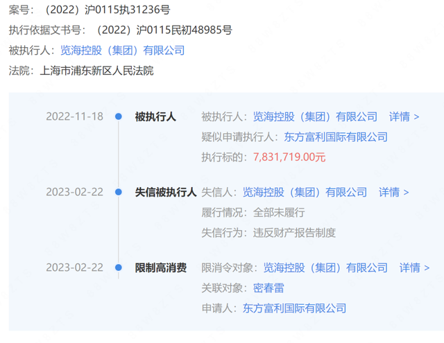 上海市浦东新区人民法院2月22日发布的限制消费令显示,在东方富利国际有限公司与览海控股(集团)有限公司(下称“览海控股”)相关合同纠纷案中,因览海控股未按执行通知书指定的期间履行生效法律文书确定的给付义务,对览海控股采取限制消费措施,限制览海控股及览海控股法定代表人密春雷不得实施高消费及非生活和工作必需的消费行为,其中包括,乘坐交通工具时,选择飞机、列车软卧、轮船二等以上舱位;在星级以上酒店等场所高消费;旅游、度假;子女就读高收费私立学校等。