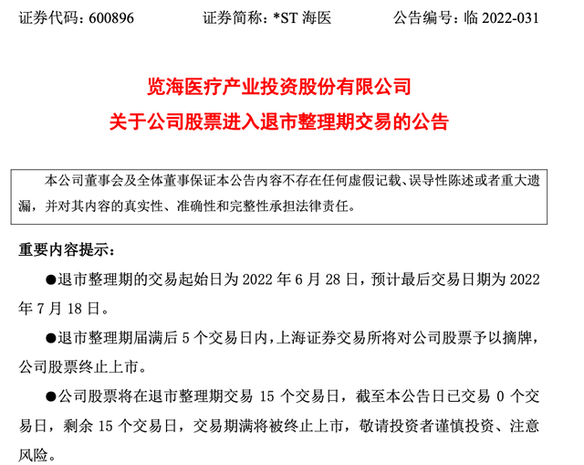 按照相关规定,览海医疗股票将于6月28日进入退市整理期交易,证券简称将由“*ST海医”变更为“退市海医”,退市整理期为15个交易日,最后交易日为7月18日。