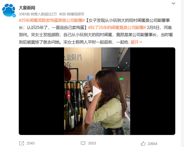 2月8日,河南郑州一名女子发现村里最好的朋友是公司的副总裁:她们认识25年了,她一直骗闺蜜是卖鸡蛋的。宋说,两人过去常常一起购物,一起吃饭,一周见六次面,但我从来不知道她是副董事长,平常问她是干啥的一直说是卖鸡蛋的。