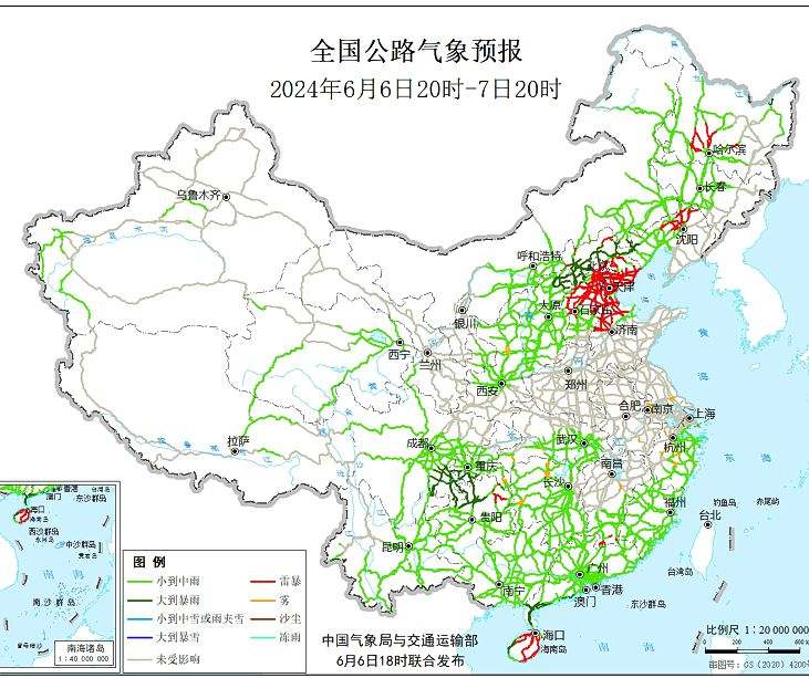 据网络资讯,据2024全国交通天气最新预报显示,内蒙古西部和东北部、黑龙江东南部、青海北部和东部、甘肃、福建东南部、四川南部和西部、云南南部、广西南部、广东中南部和海南岛等地部分地区有中到大雨,其中