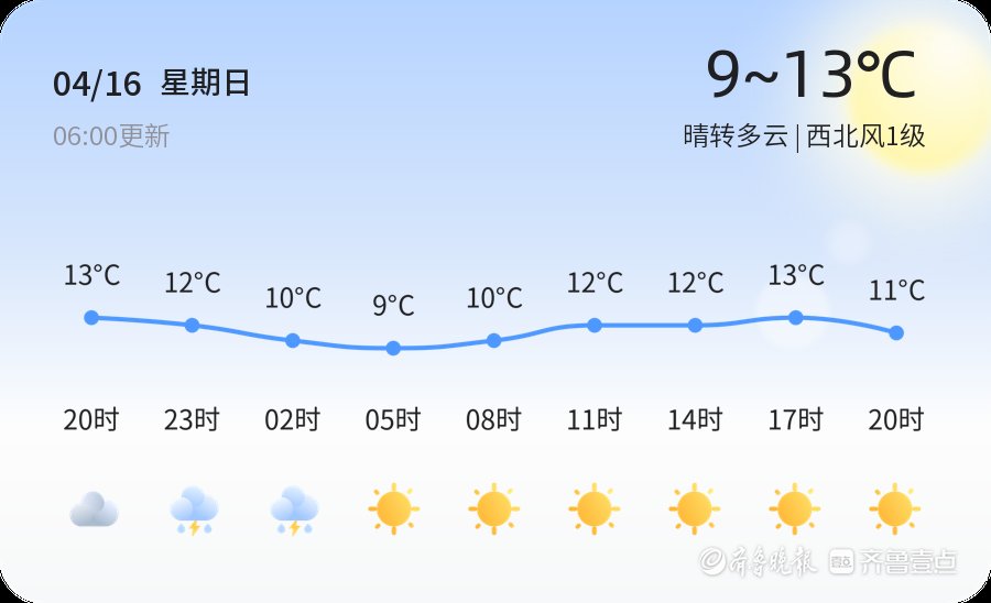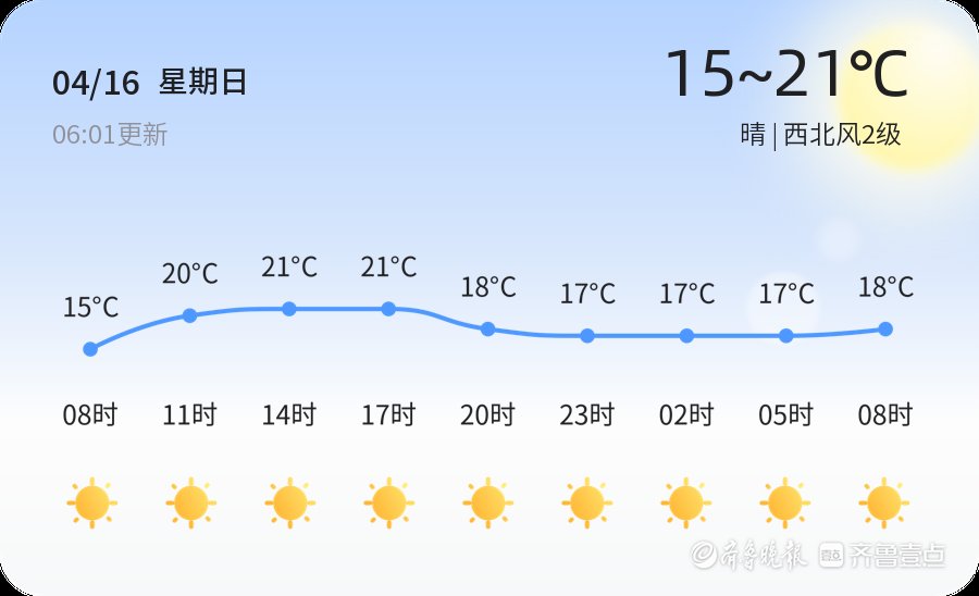 菏泽今日气候今天是4月16日,周日,阴历润 二月廿六。晴,西北风2级。气温状况:到北京时间06:01,现在温度为9℃ ,估计今日最高温度21℃,最低温度15℃。迟早可能会感受到一些微凉,请留意气候改变,留意身体